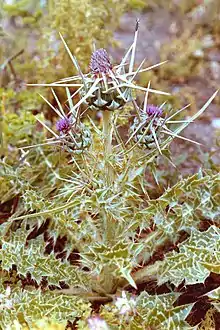 النبات شوكي يحتوي بداخله على مائع حليبي. يتأبر طبيعياً مع السلبين المريمي لينتجا (باللاتينية: Silybum × gonzaloi).