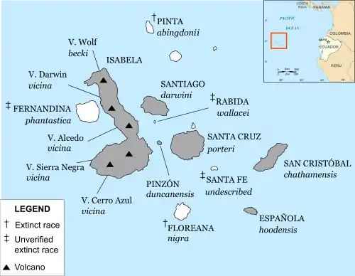 | سلحفاة جزيرة بينتا (C. n. abingdoni) سلحفاة بركان وولف (C. n. becki) سلحفاة جزيرة كاثام (C. n. chathamensis) سلحفاة جزيرة جيمس (C. n. darwini) سلحفاة جزيرة دونكان (C. n. duncanensis) سلحفاة سييرا نيغرا (C. n. guentheri) سلحفاة جزيرة القلنسوة (C. n. hoodensis) سلحفاة بركان دارون (C. n. microphyes) سلحفاة جزيرة تشارلز (C. n. nigra) سلحفاة جزيرة إندفاجيتيبل (C. n. porteri) سلحفاة بركان ألسيدو (C. n. vandenburghi) سلحفاة كهف الإغوانا (C. n. vicina) | |