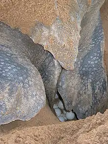 سلحفاة جلدية الظهر تنبش التراب لوضع البيض