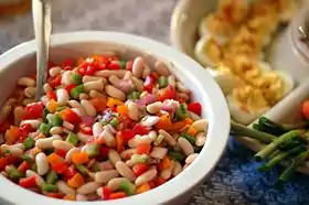 ![]() سلطة فاصولياء ملونة, مكونة من الفاصولياء البيضاء والفلفل والبصل | |