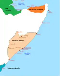 قاومت سلطنة أجوران بنجاح غزو الأورومو من الغرب والتوغل البرتغالية من الشرق خلال حرب جال مادو والحرب الأجورانية البرتغالية. تم تعزيز طرق التجارة التي يعود تاريخها إلى العصور الوسطى القديمة والمبكرة للمشاريع البحرية الصومالية، وازدهرت التجارة الخارجية في المقاطعات الساحلية حيث امتدت خطوط التجارة إلى امبراطوريات شرق آسيا والهند وأوروبا والجزيرة العربية ومصر وشرق إفريقيا.