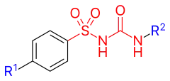 التركيبة العامة لسلفونيل يوريا، حيث يتكون الهيكل الرئيسي (بالأحمر) والسلاسل الجانبية مميزة بلون أزرق.