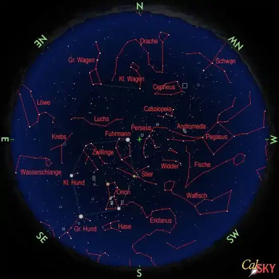 عندما ننظر إلى السماء في اتجاه الشرق فوق الأفق نجد الأسد Löwe و العقرب Krebs و الشجاع Wasserschlange . وجنوبا من نجم العيوق (Fuhrmann) نجد التشكيل الجميل لكوكبة الجبار Orion . أشد نجوم الجبار لمعانا منكب الجوزاء (النجم الأحمر اللامع ناحية وسط السماء) و حزام الجبار في وسط الجبار ويتشكل من ثلاثة نجوم. أسفل ثلاثة نجوم الحزام نستطيع بسهولة التعرف على رجل الجبار (شديد اللمعان) و سيف الجبار.