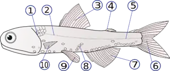 (1) غطاء الخياشيم - (2) الخط الجانبي - (3) زعنفة ظهرية - (4) زعنفة ممتلئة - (5) ملحق الذيل - (6) زعنفة ذيلية - (7) زعنفة شرجية - (8) بقع مضيئة - (9) زعنفة حوضية (زوج) - (10) زعنفة جانبية