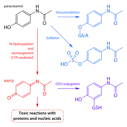 أظهر الباراسيتامول أنه آمن عندما اخذ في الجرعات العلاجية العادية {32}. بعد الجرعة العلاجية، والتي يتم تحويلها في الغالب إلى أيضات غير سامة من خلال المرحلة الثانية من عملية التمثيل الغذائي عن طريق الاقتران مع كبريتات وجلوكويورونيد، جزء صغير يجري تأكسده بواسطة نظام انزيم السيتوكروم بي450. السيتوكروم {33}و 3A4 تحول ما يقرب من 5 ٪ من الباراسيتامول إلى ناتج أيض وسيط شديد التفاعل، ن- اسيتيل -بي-بنزوكينونايمين [NAPQA] [34][36][38][40]. في ظل الظروف العادية، NAPQI يتخلص من سميته عن طريق الاقتران مع الجلوتاثيون لتكوين مشتقات السيستايين وحمض المركابتوريك {42}.