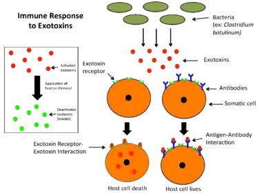 هذا الرسم التوضيحي يظهر أن السموم الخارجية تفرز بوساطة الخلايا البكتيرية, كالكلوستريديوم بوتولينيوم على سبيل المثال, وهي سامة للخلايا الجسمية. تمتلك الخلايا الجسمية أجساما مضادة على سطح الخلية لتستهدف السموم الخارجية وترتبط بها, مانعة إياها من غزو الخلايا الجسمية واجتياحها. يشكل ارتباط السم الخارجي بالجسم المضاد تفاعل مولد الضد-الجسم المضاد ويتم توجيه السموم الداخلية ليتم تحطيمها بوساطة جهاز المناعة نتيجة لذلك. إن لم يحصل هذا التفاعل بين الجسم المضاد والسم الخارجي, فإن الأخير يرتبط بمستقبلات السموم الخارجية التي توجد على سطح الخلية ويسبب موت خلية العائل عن طريق تثبيط عملية اصطناع البروتين. يظهر هذا الرسم التوضيحي أيضا أن تطبيق عوامل الحرارة والمواد الكيميائية يمكن أن يتسبب في تعطيل السموم الخارجية. تسمى السموم الخارجية التي تم تعطيلها بالسُّمِّينات الموهَّنة أو التكسينات الموهنة وهي ليست ضارة بالخلايا الجسمية.