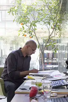 ![]() سنان عبد القادر في مكتبه في القُدس | |