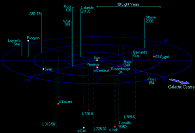 ![]() خريطة توضح النجوم التي تقع على بعد 12.5 سنة ضوئية من الشمس | |