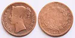 | وجه العملة: وجه جانبي متوج بحروف الملكة فيكتوريا | ظهر العملة: القيمة الاسمية والسنة واسم "شركة الهند الشرقية" محفور في داخل إكليل. |