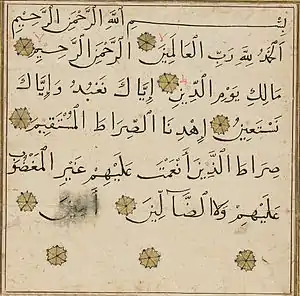 سورة الفاتحة أو السبع المثاني أو أم الكتاب هي أعظم سورة في القرآن الكريم، لقول النبي محمد: «الحمد لله رب العالمين هي السبع المثاني، والقرآن العظيم الذي أوتيته»، وذلك لأنها افتتح بها المصحف في الكتابة، ولأنها تفتتح بها الصلاة في القراءة.[2][3] لسورة الفاتحة أسماء كثيرة عدها السيوطي في كتاب الإتقان في علوم القرآن خمسةً وعشرين اسمًا بين ألقاب وصفات جرت على ألسنة القراء من عهد السلف، ومنها: القرآن العظيم، وسورة الحمد، والوافية، والكافية.[4] وقد أجمع جمهور العلماء على أن آيات سورة الفاتحة سبع آيات وذلك باتفاق القراء والمفسرين، ولم يشذ عن ذلك إلا ثلاثة: الحسن البصري وقال إنهن ثمان آيات، وقال عمرو بن عبيد والحسين الجعفي إنهن ست آيات، واستدل الجمهور بقول الرسول: «السبع المثاني». وتعد السورة سورة مكية أُنزلت قبل هجرة الرسول من مكة، وهو قول أكثر العلماء، وكان ترتيبها في النزول خامسًا على قول بدر الدين الزركشي بعد سورة العلق وسورة القلم وسورة المزمل وسورة المدثر.[5]