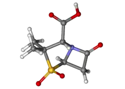 سولباكتام (Sulbactam) الزمرة الدوائية مضادات الجراثيم.[1] مضاد حيوي[2] من زمرة مثبطات البيتالاكتاماز.[3] السُّلبَاكتام هو نوعٌ من الأدوية المعروفة باسم مثبِّطات البيتا اللاكتاماز (β-lactamase) ويجري تَضمينُه في بعض الادوية مع مواد فعالة أخرى كالأَمبيسيلِّين لأنَّه يَحول دون عمل إنزيم بيتا اللاكتاماز الذي تُنتجه بعض الجراثيم، وبذلك يحمى الأَمبيسيلِّين من التخريب بالمِكروب.