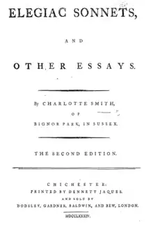 ![]() صفحة العنوان من الإصدار الثاني لكتاب شارلوت سميث "إليجايك سونيتس". | |