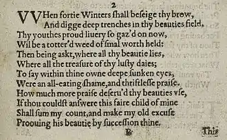 ![]() Detail of old-spelling text الخطوط الاثني عشر الأولى من سونيت 2 في كوارتو 1609 | |||||||