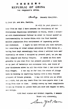 في التاسع والعشرين ديسمبر 1911، انتخب ممثلين من الأقاليم الصينية في اجتماع في نانجينغ، سين "رئيس الحكومة الإقليمية" (الصينية: 臨時大總統).[76] وأصبح الأول من يناير 1912 اليوم الأول من إعلان الجمهورية الصينية.[77]