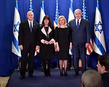 كارين بينس وسارة نتنياهو، السيدة الثانية للولايات المتحدة وإسرائيل على التوالي، إلى جانب أزواجهم ونائب الرئيس الأمريكي مايك بنس ورئيس الوزراء الإسرائيلي بنيامين نتانياهو.