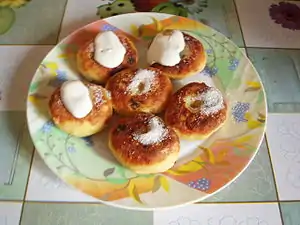 - Ion, Larisa (2017-05-18). "Syrniki - traditional Russian and Ukrainian cottage cheese pancakes". RedNumberONE (باللغة الإنجليزية). مؤرشف من الأصل في 23 سبتمبر 2019. اطلع عليه بتاريخ 06 أكتوبر 2019. الوسيط