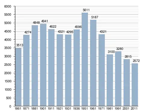 في سنة 1861 بلغ عدد السكان 3٬513 نسمة، وتطور العدد ليصل في سنة 2011 لـ 2٬572 نسمة.