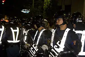 في وقت لاحق في خمسينيات القرن الماضي، أول فرق مكافحة الشغب الفعلية المسلحة بدروع مكافحة الشغب والهراوات. كان الهدف هو أن يقوم ضباط درع الشغب بإيقاف الخطوط. عندما وصلوا إلى الاتصال الفعلي مع الحشود ، كان من المفترض أن يساعد الضباط بالهراوات ضباط مكافحة الشغب. ولكن إذا تم استخدام القوة المميتة ضدهم، فليس هناك تدريب أو إجراء لمواجهة ذلك. تم ترك الضباط في هذه المرحلة للدفاع عن أنفسهم.[12]