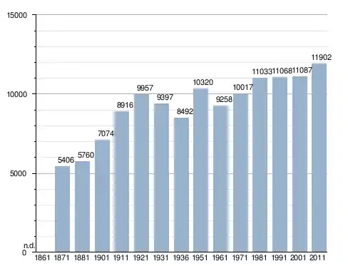 في سنة 1871 بلغ عدد السكان 5٬406 نسمة، وتطور العدد ليصل في سنة 2011 لـ 11٬902 نسمة.