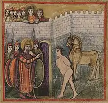 سينون أسيراً أمام أسوار طروادة ، لوحة من كتاب فيرجيليوس رومانوس (Vergilius Romanus)، القرن الخامس الميلادي.