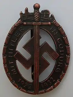 أمر هتلر بشارة كوبورغ في 14 أكتوبر 1932 لإحياء ذكرى الحدث الذي وقع قبل عشر سنوات، يوم السبت، 14 أكتوبر 1922، وتكريم المشاركين. [2] كان هذا قبل وصول هتلر إلى السلطة في يناير 1933. وكانت الشارة بعرض 40 ملم وارتفاع 54 مم. تم صنعها من البرونز وظهر سيفًا غيضًا في أسفل وجه الصليب المعقوف داخل إكليل بيضاوي. [2] [3]