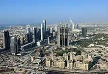 شارع الشيخ زايد هو موطن لمعظم ناطحات السحاب في دبي، بما في ذلك أبراج الإمارات. يربط الطريق السريع أيضًا مشاريع جديدة أخرى مثل نخلة الجميرة ودبي مارينا، ويمتد على طول الطريق معظم الخط الأحمر لمترو دبي.[4] يوجد في دبي نفسها الكثير من الطريق السريع من سبعة إلى ثمانية ممرات في كل اتجاه.