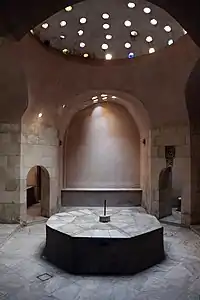 الحمام مبني على طراز الحمامات العامة الإسلامية في العصور الوسطى، حيث يتكون من مدخل بسيط يؤدي إلى ممر منكسر يؤدي إلى الحجرة الباردة حيث يتم خلع الملابس للاستعداد للاستحمام، ويتواجد بها مقاعد للجلوس وخزانات لحفظ المتعلقات الشخصية، وتؤدي تلك الحجرة إلى ممر آخر يصل إلى الحجرة الدافئة فالحجرة الساخنة، وقد استخدمت بكل من الحجرة الباردة والساخنة القباب الضحلة للمحافظة على دورة الهواء الساخن، وتتميز الحجرة الساخنة بمساحة مثمنة يتوسطها الحوض ويتعامد عليها أربعة إيوانات للجلوس وأربعة مداخل في الأركان تؤدى إلى خلوات بكل منها أحواض ومساطب.[41] | ||||||