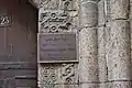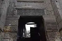 يتكون الباب من برجين كل منهما بواجهة مستديرة، وكتلة المدخل هو تجويف عميق بين البرجين، ويعلو المدخل عقد نصف دائري، بحافة مشطوفة، وتقع فتحة الباب في مقدمة التجويف. ويؤدي المدخل إلى ساحة داخلية تغطيها قبة ضحله وعلى جانبي البرجين طاقتان كبيرتان. وفي أعلى المدخل كوابيل كل منها على هيئة رأس كبش ذو قرنين. وبناء برجي الباب مصمت إلى ثلثي الارتفاع، وتعلو الجزء المصمت لكل من البرجين غرفة دفاعية. والباب مزين بأسهم وفتحات لسكب السوائل المغلية على الأعداء المعتدين. وتبرز ثلث الكتلة البنائية للباب خارج الأسوار أما الثلثان الباقيان فيقعان داخل المدينة.[19][20] | |||
