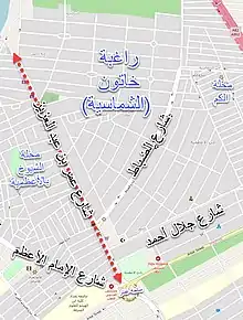 أول حي عن يمين الشارع هو حي راغبة خاتون.وأول المعالم هناك هو نادي الأعظمية وأما عن يسار الشارع فتقع محلة هيبت خاتون التي فيها بدالة الأعظمية ويمضي الشارع متجهاً شمالاً حتى يصل إلى تقاطع مكتبة الصباح وبعد التقاطع تقع راغبة خاتون عن اليمين وأما اليسار فتقع محلة الشيوخ (من حي الأعظمية) ويستمر الشارع حتى يصل إلى عمارة على هيئة الباخرة، حيث ينتهي الشارع.ليبدأ شارع آخر امتداد له وهو شارع رشيد عالي الكيلاني.[3]