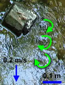 يبين الفيديو أسفله صورة متحركة مبينا نشأة دوامات في الماء عند عبورها لعائق، ونرى الدوامات تتحرك مع تيار الماء، كما نرى أن اتجاه دوران الدوامة يكون في اتجاه العائق .