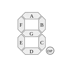 الأقسام أو القطاعات السبعة للشاشة يشار لها بالأحرف الإنجليزية من A إلى G، أما بالنسبة للنقطة العشرية DP فهو "قسم ثامن" اختياري يستخدم لعرض الأرقام اللاصحيحة (الأرقام ذات الكسور).[2]