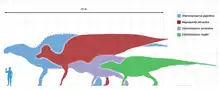 الشانتونجوصورس (الأزرق) في مقارنة مع الأورنيثوبودات العملاقة الأخرى والإنسان