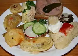 إن وجبة الشاي (وتعرف أيضًا باسم شاي العشاء[9]) وهي وجبة المساء، تؤكل عادة ما بين الساعة 5 مساءً و7 مساءً. وكثيرًا ما يتبعها الآن وجبة خفيفة في وقت لاحق في المساء.[بحاجة لمصدر]