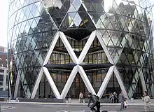 بالتالي، فأن الشبكة الوترية هذه تغني عن الحاجة لأعمدة الزوايا الكبيرة، وتوفر توزيع أفضل للأحمال في حالة وجود خطر على المبنى.[1] هناك مبنى آخر صممه السير نورمان فوستر بهذا النظام الهيكلي، وهو برج سويس ري في لندن، والمعروف بإسم "الخيارة".