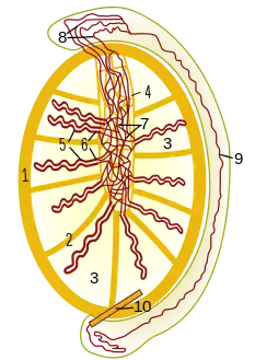 ![]() Schematic drawing of خصية and بربخ. 1 غلالة بيضاء (توضيح), 2 Septula testis, 3 Lobulus testis, 4 منصف الخصية , 5 نبيبات ناقلة للمني, 6 نبيبات مستقيمة ناقلة للمني , 7 Rete testis, 8 Ductuli efferentes testis, 9 بربخ, 10 initial part of أسهر | |