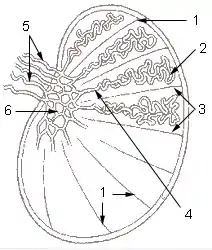 ![]() 1: Testicular septa 2: نبيبات ناقلة للمني 3: Testicular lobules 4: Straight seminiferous tubules 5: Efferent ductules 6: Rete testis 1: Testicular septa 2: نبيبات ناقلة للمني 3: Testicular lobules 4: Straight seminiferous tubules 5: Efferent ductules 6: Rete testis | |