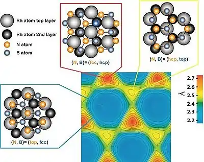 في حين تعبر الصورة على الجانب الأيسر عن الحساب النظري في نفس المنطقة، حيث يتم إعطاء وتحديد ارتفاع النيتروجين نسبياً إلى الركيزة التحتية الأساسية. ويتم توفير الترتيب المحدد لذرات الروديوم، النيتروجين، والبورون في ثلاثة مناطقٍ مختلفةٍ (الأزرق: المسام، الأسفر- الأحمر: الأسلاك). |