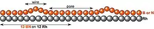 حيث تتكون وحدة الخلية لشبكة (نيتريد البورون السداسية)النانوية h-BN من ذرات 13x13 BN أو 12x12 Rh مع ثابت بلوري (بالإنجليزية: lattice constant) يُقَدَرُ بـ 3.2 نانومتراً. وهذا يعني أنه في قطاعٍ عرضيٍ، تجلس 13 ذرةً من البورون أو النيتروجين على 12 ذرةً من الروديوم. وهذا يستوجب تعديلاً في المواقع النسبية لكل ذرةٍ نيتريد بورون نحو ذرات الركيزة داخل وحدة الخلية، حيث تكون بعض الروابط الكيميائية أكثر جاذبيةٍ أو نفوراً (طرداً) من الأخرى (موقع الرابطة الانتقائية)، وهو ما يحث على تموج الشبكة النانوية (انظر يساراً للصورة ذات المسام والأسلاك).