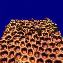 - Pores, apertures, holes: areas of the nanomesh laying the closest to the underlying substrate due to a strong attraction. They form depressions, which are 0.05 nm deep and have a hexagonal shape.