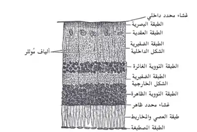 تحتوي شبكية الفقاريات على عشر طبقات متميزة. [18] من الأقرب إلى الأبعد عن الجسم الزجاجي: