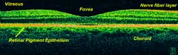 باستخدام التصوير المقطعي البصري (OCT)، هناك 18 طبقة يمكن تحديدها في شبكية العين. الطبقات والارتباط التشريحي هي كما يلي: [27] [28] [29]