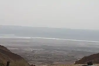 منظر منطقة اللسان من مرتفعات الكرك على الجهة الأردنية باتجاه الغرب.