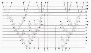 من A تتشعب خطوط تظهر تفرع سلف منتجا أصناف جديدة، من هذه الأصناف ما إنقرض، وبالتالي بعد عشرة آلاف جيل أصبح أحفاد A أصناف جديدة مختلفة أو حتى سلالات (بالإنجليزية: Subspecies) a10, f10, و m10. وبالمثل فإن أحفاد I تباينت لتصبح أصناف جديدة مختلفة w10 و z10. وبعد أربعة آلاف جيل آخرى يصبح يصبح أحفاد A و I أربعة عشر صنف جديد مرقمة من a14 إلى z14. بينما استمرت F لأربعة عشر جيل لم تتغير نسبياً، وانقرض الأنواع B,C,D,E,G,H,K و L.