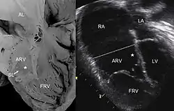 ![]() عينة مرضية لصورة تحت الأمواج الصوتية لقلب مصاب بشذوذ إبشتاين. المختصرات: RA: الأذين الأيمن ARV:البطين الأيمن متأثرا بالأذين FRV: البطين الأيمن الوظيفي AL:الوريقة الأمامية SL: وريقة حاجزية LA: الأذين الأيسر LV: البطين الأيسر عينة مرضية لصورة تحت الأمواج الصوتية لقلب مصاب بشذوذ إبشتاين. المختصرات: RA: الأذين الأيمن ARV:البطين الأيمن متأثرا بالأذين FRV: البطين الأيمن الوظيفي AL:الوريقة الأمامية SL: وريقة حاجزية LA: الأذين الأيسر LV: البطين الأيسر | |