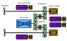 هذه الصورة من صور الدفع البحري المشترك تعد تعديلاً للنظام المسمى شراكة ديزل وغاز CODAG. وأما عن شراكة ديزل/كهرباء أو غاز CODLOG فهي البديل، الذي يوظف نفس العناصر الأساسية لشراكة CODLAG ، دون أن يسمح بالإستخدام المتزامن لمصادر الدفع. [1] و تستخدم CODLAG المحركات الكهربائية المرتبطة بعمود الرفاص (المروحة/الدافع/الداسر) وعادة مايكونا بعدد إثنين. وهذه المحركات تدار بمولدات الديزل. وللحصول على سرعات أعلى، فإن توربينات الغاز تدير أعمدة الرفاصات عبر إتصال صليبي لصندوق التروس، أما لسرعة التجوال Cruise speed فيتم فصل التوربينات بواسطة القابض (دربرياج) Clutch. [2]