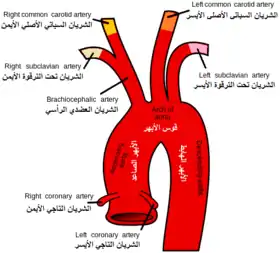 ![]() قوس الأبهر وتفرعاته. (شريان تحت الترقوة الأيمن موجود في أعلى اليسار، والشريان الأيسر موجود في أعلى اليمين في الصورة) قوس الأبهر وتفرعاته. (شريان تحت الترقوة الأيمن موجود في أعلى اليسار، والشريان الأيسر موجود في أعلى اليمين في الصورة) | |