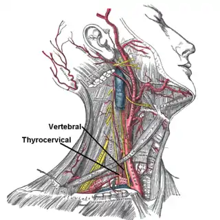 | الجذع الدرقي الرقبي | وهو قصير جدا، وينقسم إلى الشريان الدرقي السفلي، الشريان فوق الكتف والشريان الرقبي المستعرض (ويُسمى أيضا الجذع الرقبي الظهري) | |