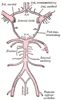 ![]() رسم تخطيطي للدورة الشريانية في قاعدة الدماغ. (الشريان السمعي الداخلي مُشار إليه في وسط اليمين) | |