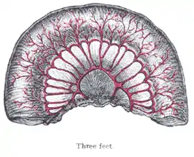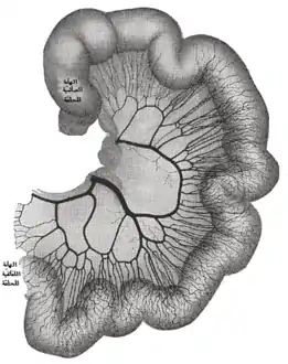![]() عقد الأمعاء الدقيقة، وتظهر توزيع الشرايين المعوية. | |