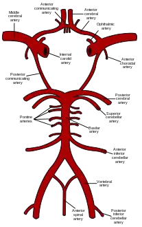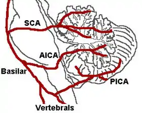 ![]() The three major arteries of the cerebellum: the SCA, AICA, and PICA. (Vertebrals labeled at bottom.) The three major arteries of the cerebellum: the SCA, AICA, and PICA. (Vertebrals labeled at bottom.) | |